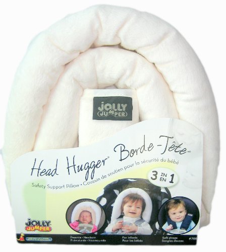 * 3 in 1 Support pillow includes pillows for preemies and infants. Also includes soft straps for car seats * Can be used in car seats, strollers, bouncers and cribs * Soft straps are reversible and fit all standard car seats * Machine Washable The Jolly Jumper Head Hugger Safety Support Pillow helps protect baby's head by holding it snugly in place. A preemie pillow is included. Soft straps are also included to prevent the straps from rubbing against the baby.