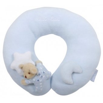 Plush, light and luxurious ergonomic neck pillow. Especially designed to comfortably support baby's head and neck on car seats or strollers and perfect companion for toddlers on planes, trains and automobiles. Made of high-quality soft cotton velour and hypoallergenic materials. Unique design for a very special little one. Machine washable. Measures 9" x 9" x 2.5". Look for matching car seat harness pads and pacifier leash, also available on this classic Moons & Stars Collection. Imported from Europe.