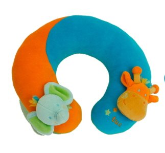 Plush, light and luxurious ergonomic neck pillow. Especially designed to comfortably support baby's head and neck on car seats or strollers and perfect companion for toddlers on planes, trains and automobiles. Made of high-quality soft cotton velour and hypoallergenic materials. Unique design for a very special little one. Machine washable. Measures 9" x 9" x 2.5". Look for matching car seat harness pads and pacifier leash, also available on this Circus Collection. Imported from Europe.